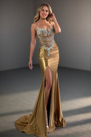 Mermaid Satin Gold Spaghetti Straps Long Prom Dress With Slit