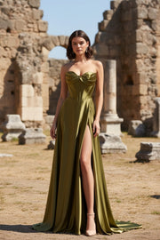 Appliques Ruched Slit Corset Bodice Prom Dress