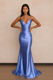 Blue Satin Open Back Prom Dress