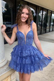 Blue Tiered Homecoming Dress with Corset Bodice