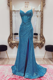 Blue Sequin Corset Prom Dress