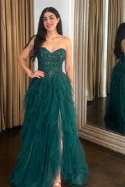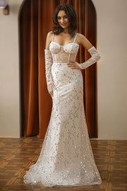 One Shoulder Ruffle Sheer Corset Bodice Prom Dress