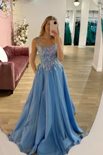 A-Line Blue Tulle Prom Dress With Appliques
