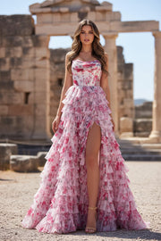 Pink Floral Prom Dress with Ruffle Skirt