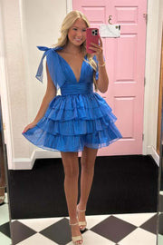 Blue Floral Cut-outs Ruffle Hem Homecoming Dress