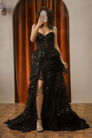 One Shoulder Ruffle Sheer Corset Bodice Prom Dress