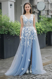 Blue Appliques V-neck Tulle Prom Dress with Slit