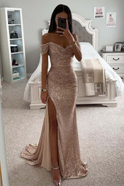 Off the Shoulder Rose Gold Slit Prom Dress