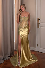 Mermaid Gold Satin Strapless Long Prom Dress With Slit