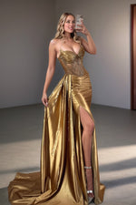 Mermaid Satin Gold Strapless Sweetheart Long Prom Dress