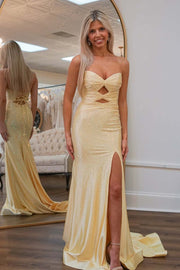 Pleated Metallic Strapless Prom Dress with Keyholes