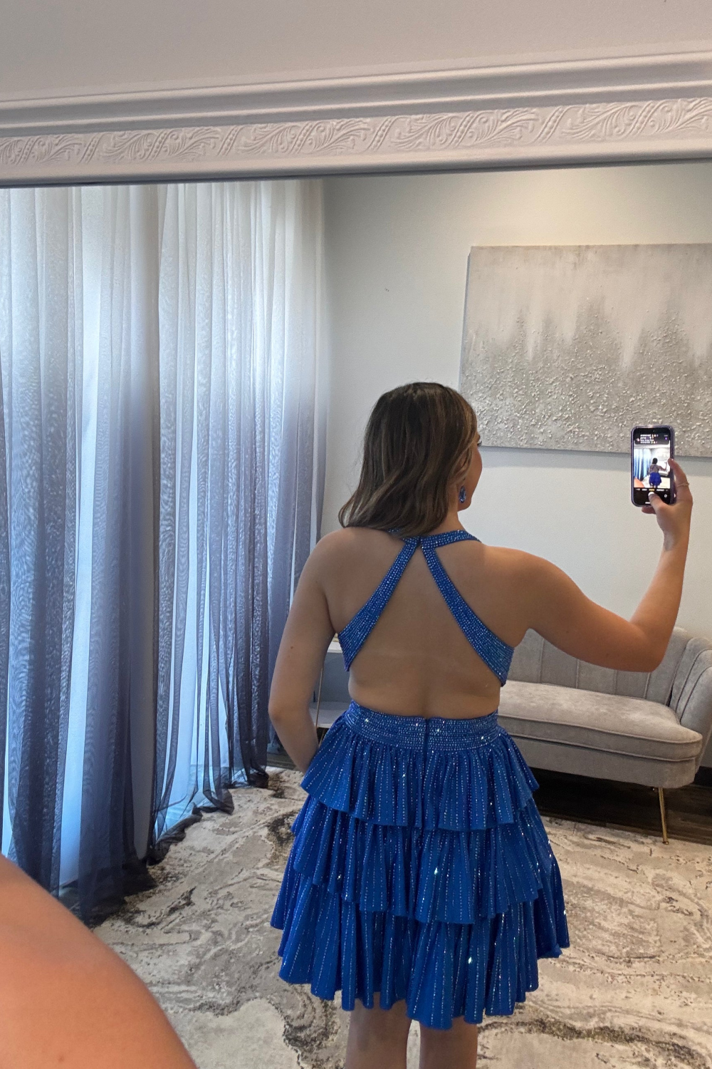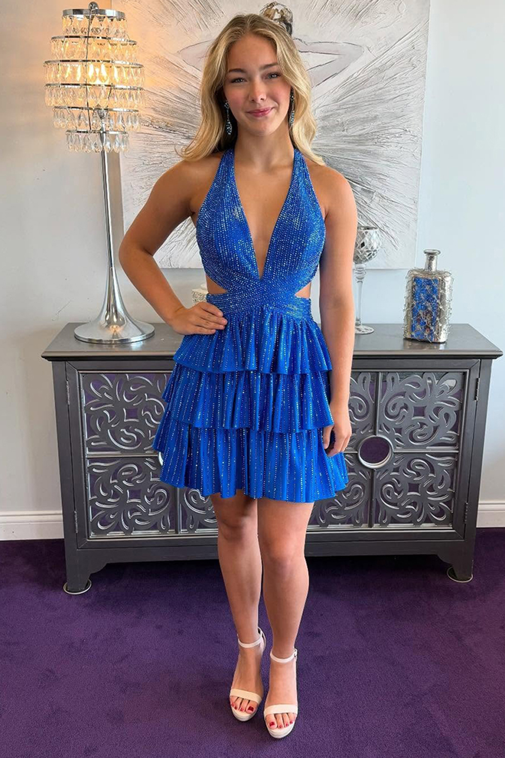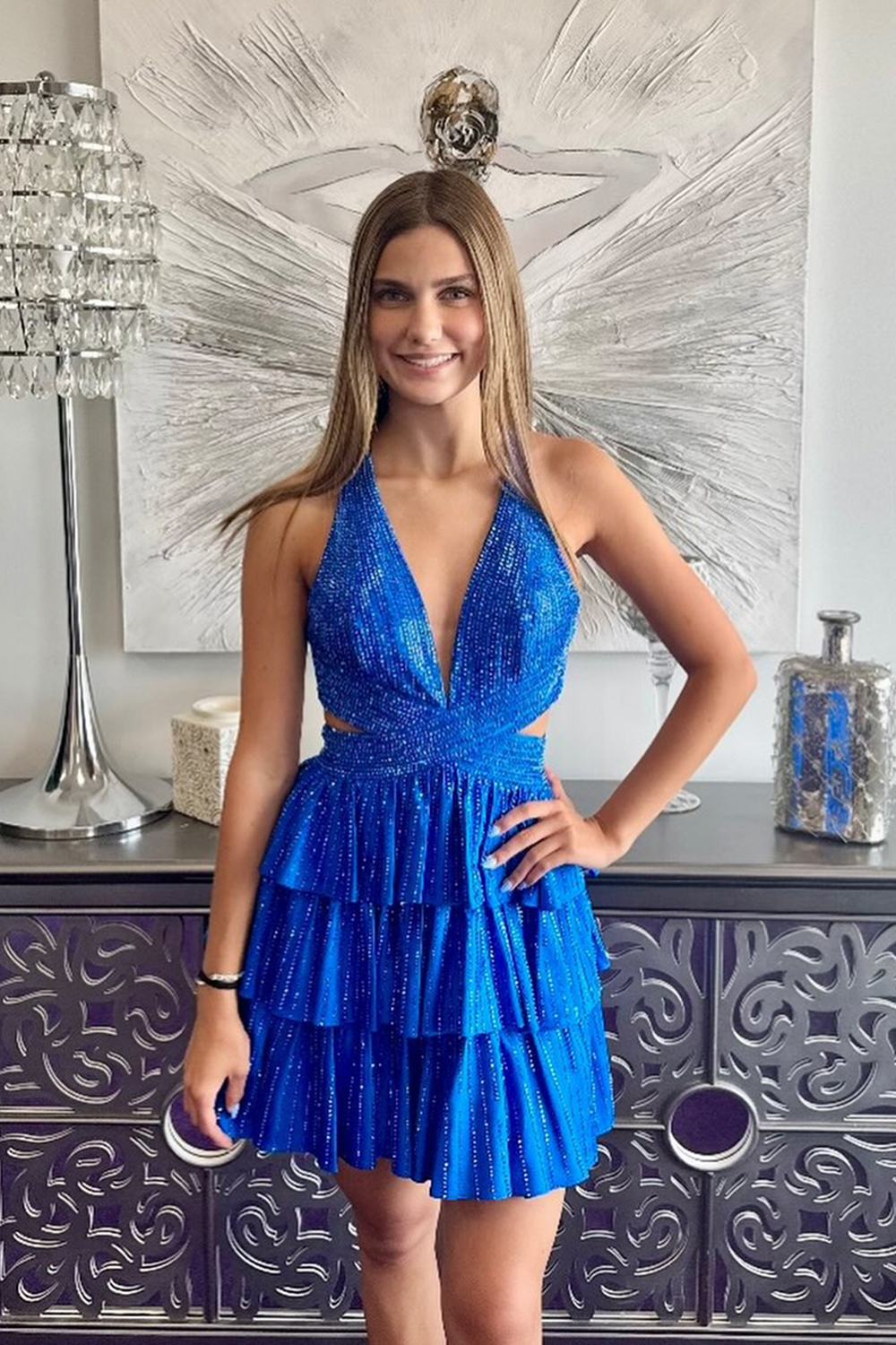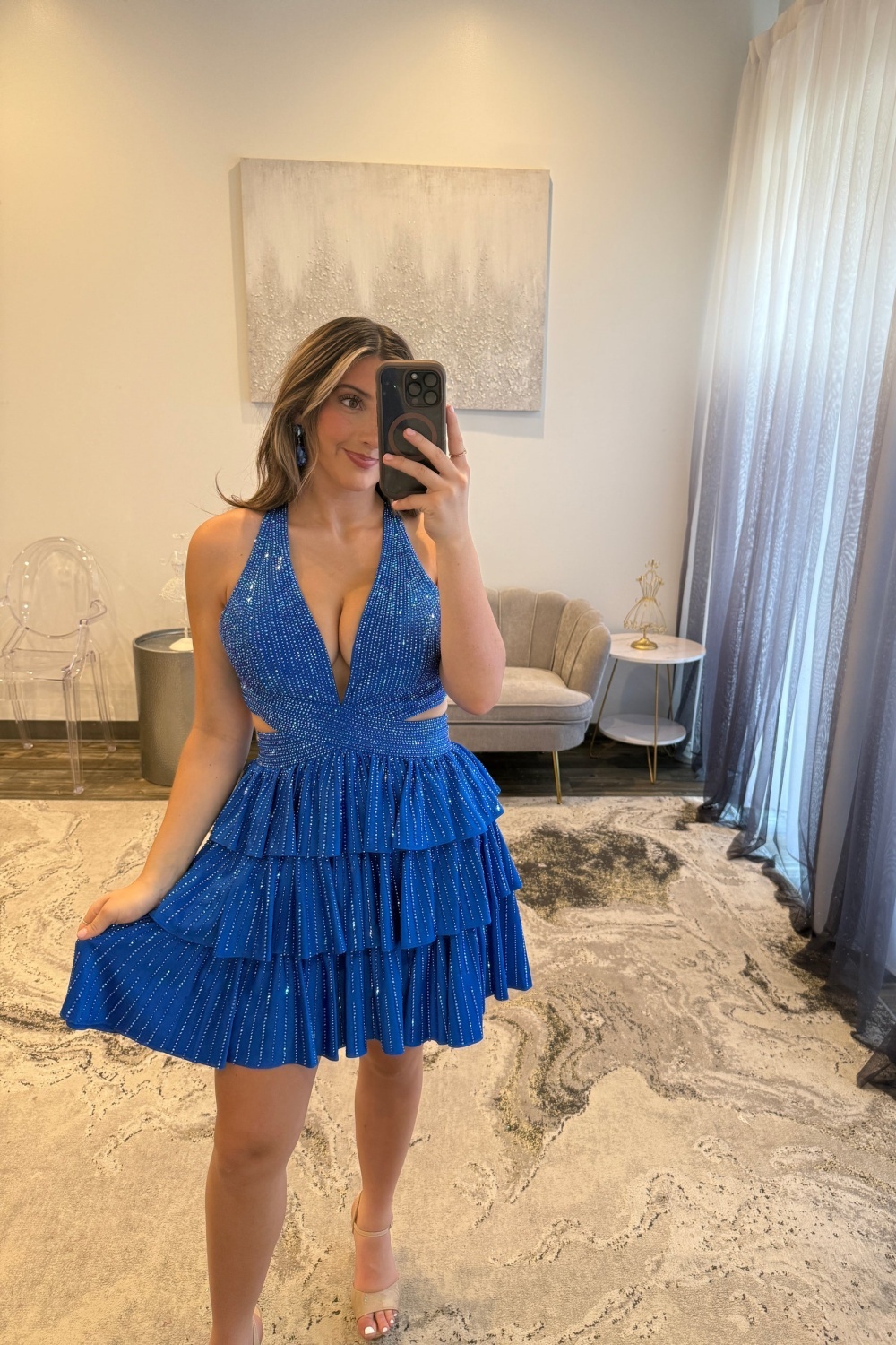 Featured: Shine bright and dance all night in this dreamy sparkle red mini dress. Featuring a plunging V-neckline and side cutouts at the waist, the fitted A-line bodice is adorned with dazzling rhinestones that catch the light from every angle. The playful tiered ruffle skirt adds volume, movement, and a fun flirty finish. Complete with an open back and secure halter strap, this dress combines elegance with a youthful edge—ready to turn heads at every celebration.